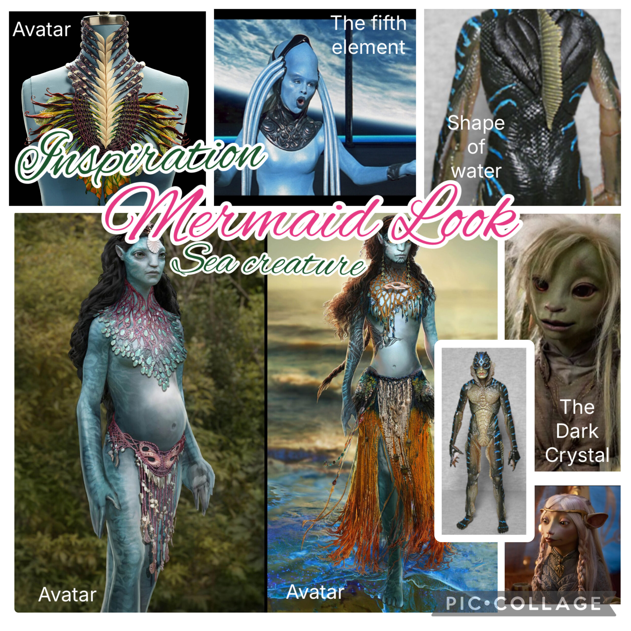 I looked at fantasy water creatures such as the creature from The Shape of Water and Avatar. I also like the way the feminine characters in The Dark Crystal are styled, especially those big eyes. I would like the mermaid to look cut like that even though she would not look like a human.