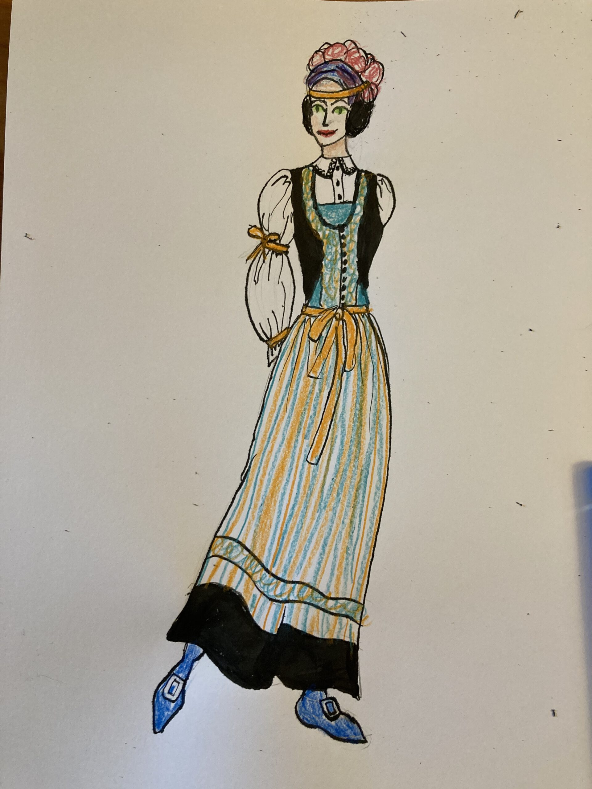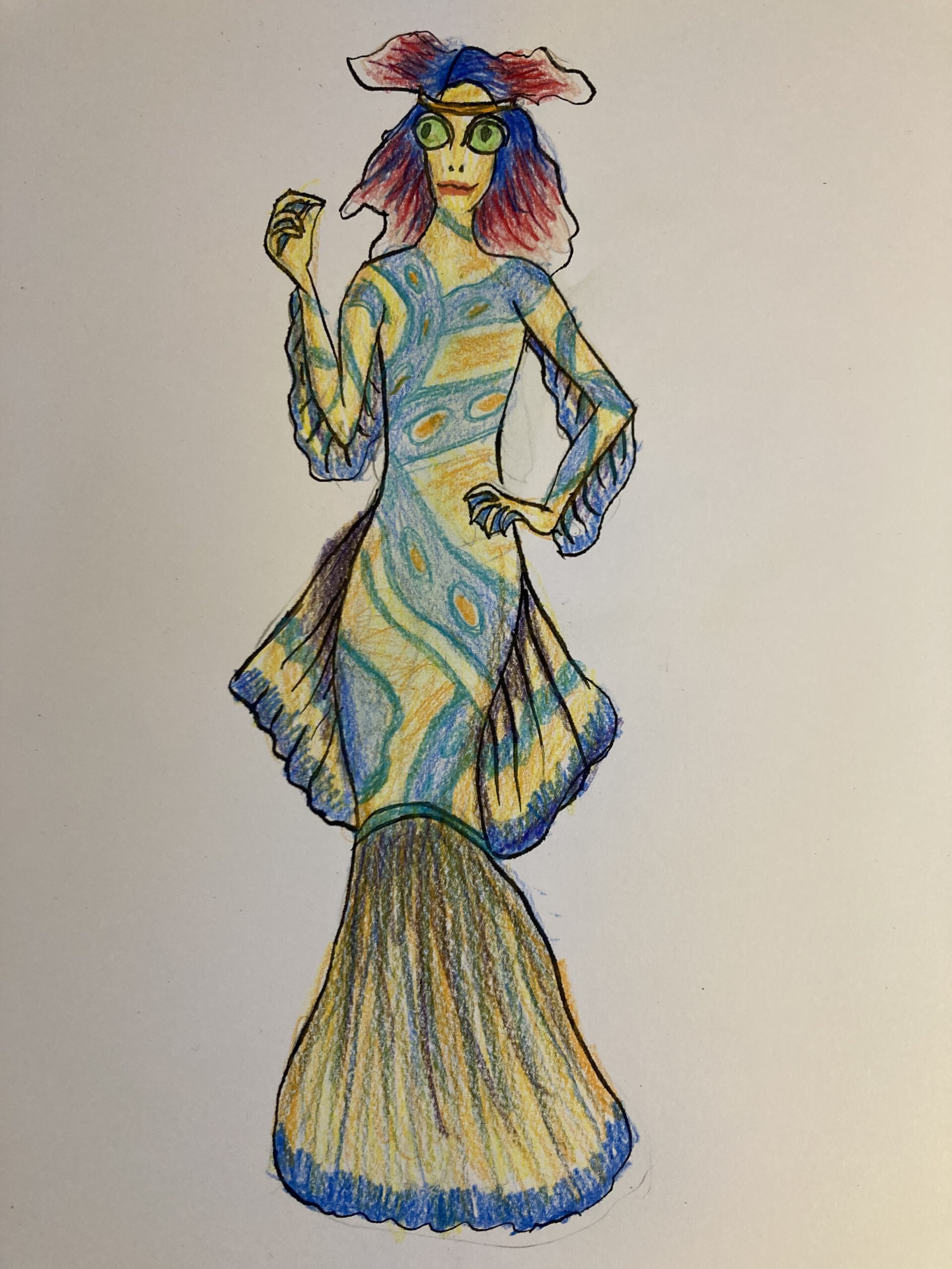 For her human design, I chose a headpiece with fabric that resembles the fins on top of her head. I imagine the mermaid found or stole this outfit when she became human. Looking at it now, I think it shouldn’t fit perfectly and should be worn slightly differently than how traditional Danish clothing would normally be styled.