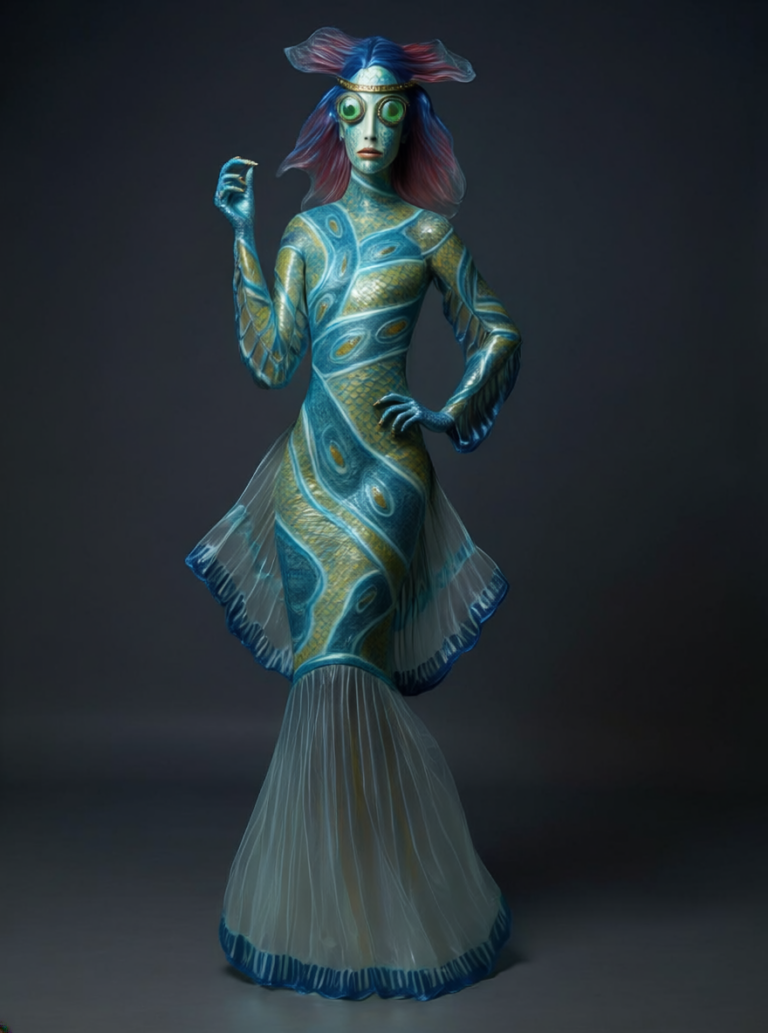 For my version, I wanted to go darker (more in line with how the story was originally intended by Hans Christian Andersen). I want the mermaid to look more like a fish, with large, fish-like eyes. I found some amazing tropical fish that could work well as inspiration. I also don’t want her to have long human hair—it doesn’t make much sense underwater, as it would break and tangle into massive knots. Instead, I envision beautiful fins on top of her head that resemble hair.